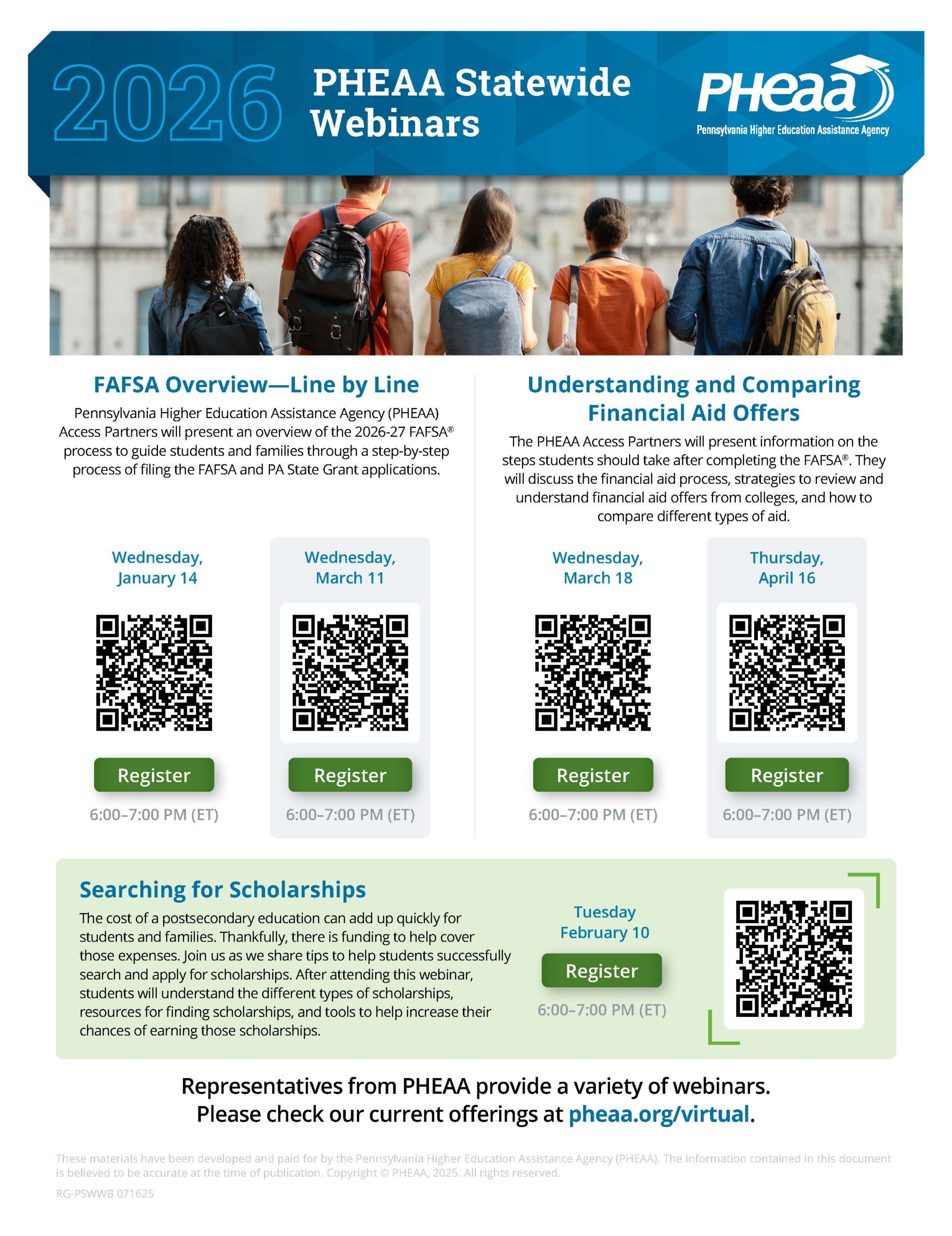 Link to below flyer: 2026 PHEAA Statewide Webinars